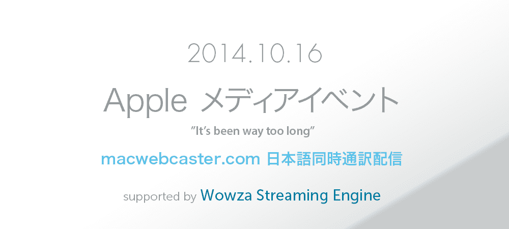 米国 Apple 社が 2014 年 10 月 16 日(日本時間 10 月 17 日 午前 2 時)より開催する(新型 iPad 発表と思われる) ”It’s been way too long” メディアイベントにおいて、日本語同時通訳を macwebcaster.com (マックウェブキャスター・ドットコム)が行います。日本語通訳音声は株式会社 JIMA の協力の元、DPSJ (日本デジタル・プロセシング・システムズ株式会社)が取扱うストリーミング配信サーバー「Wowza Streaming Engine」(ワウザ・ストリーミングエンジン)を使って配信されます。